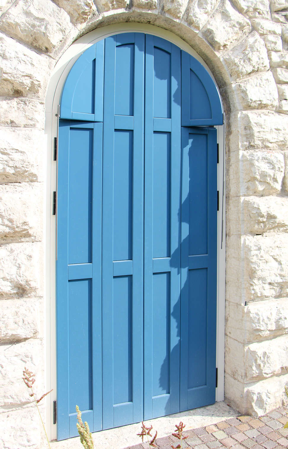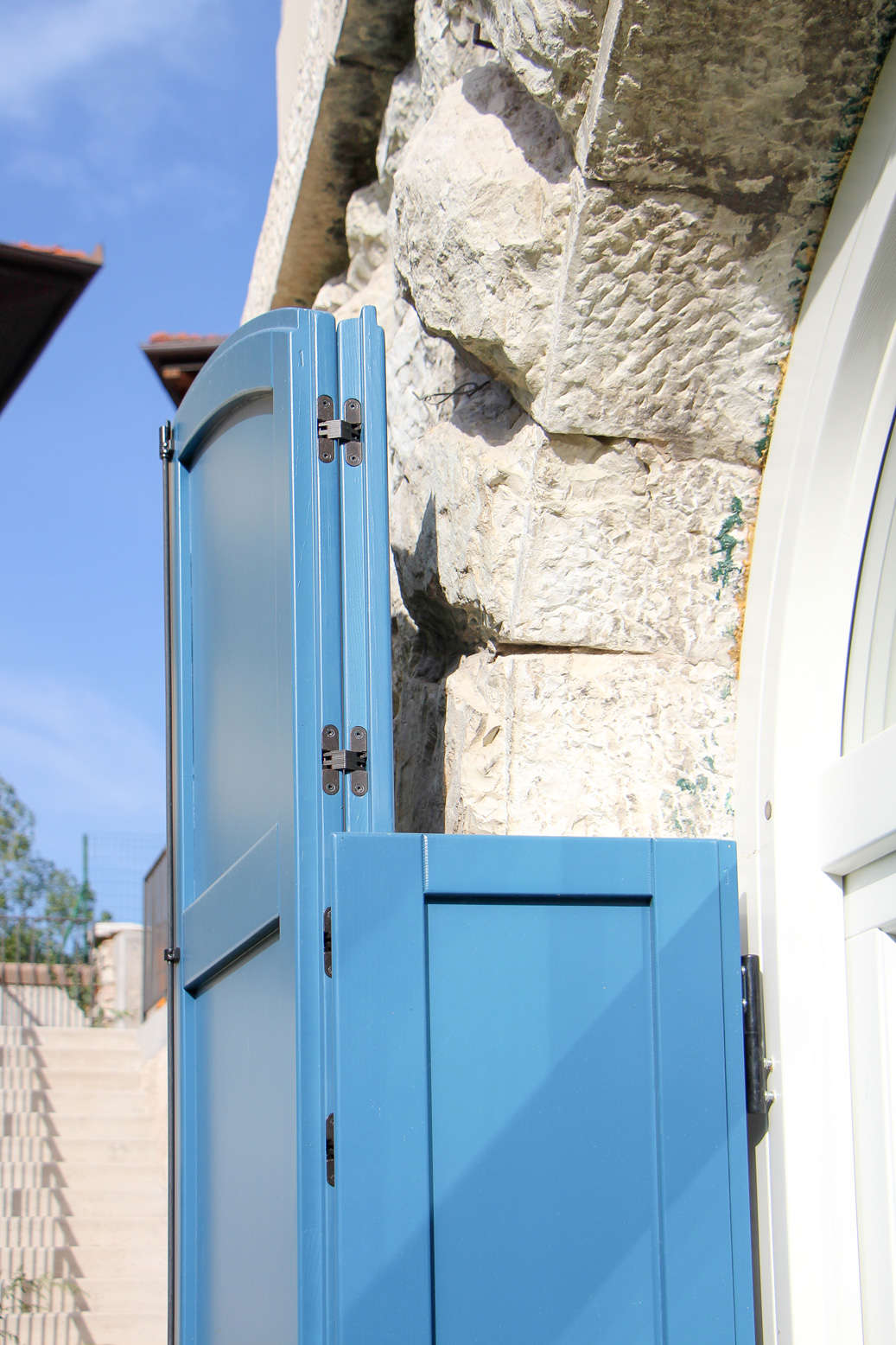 Gli scuri, con pannello bugnato e griglia mobile, sono realizzati sia rettangolari che ad arco, in un gioco visivo movimentato. Il colore è un particolare e vivace blu. Gli scuri delle portefinestre sono a libro.