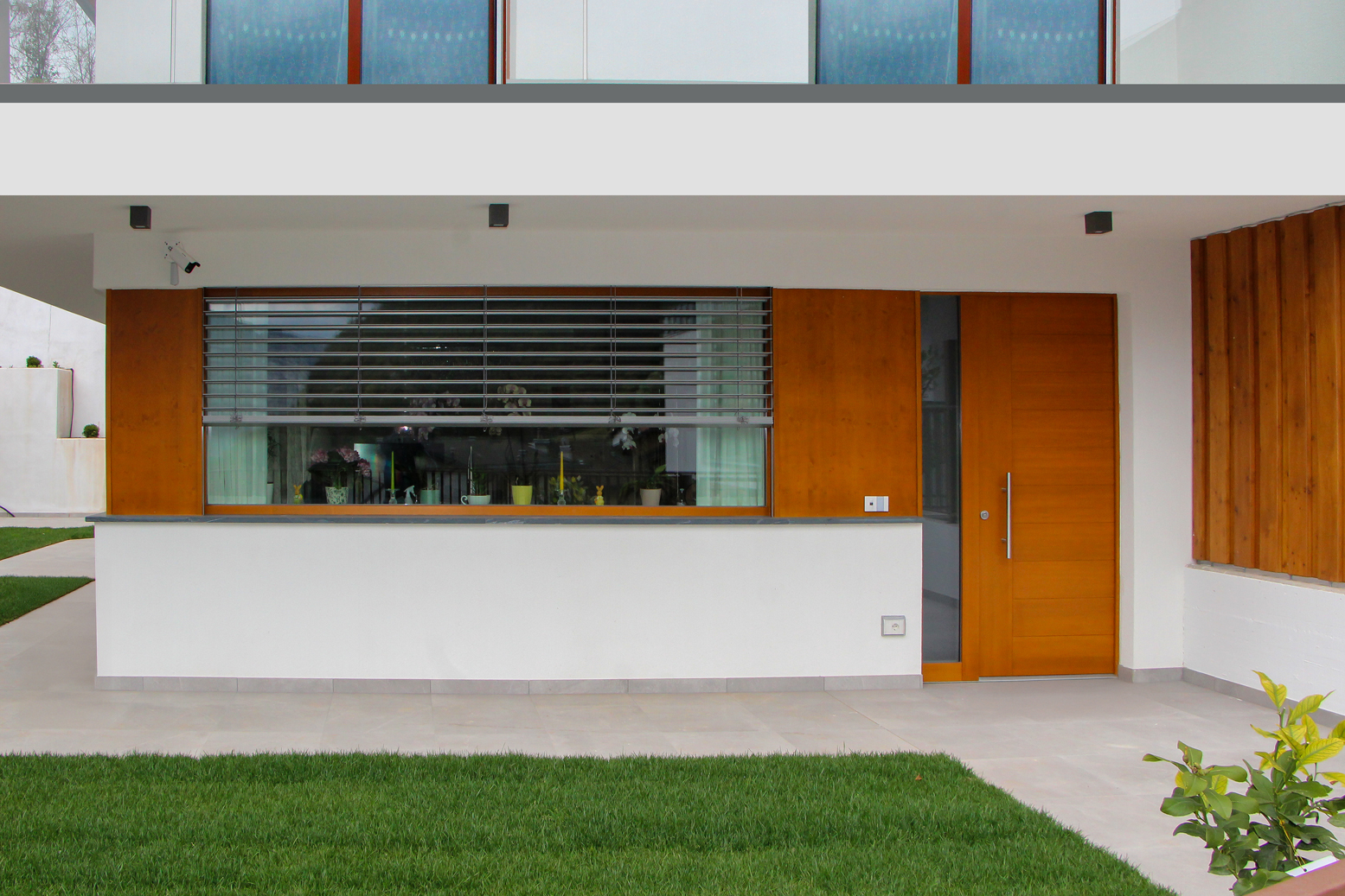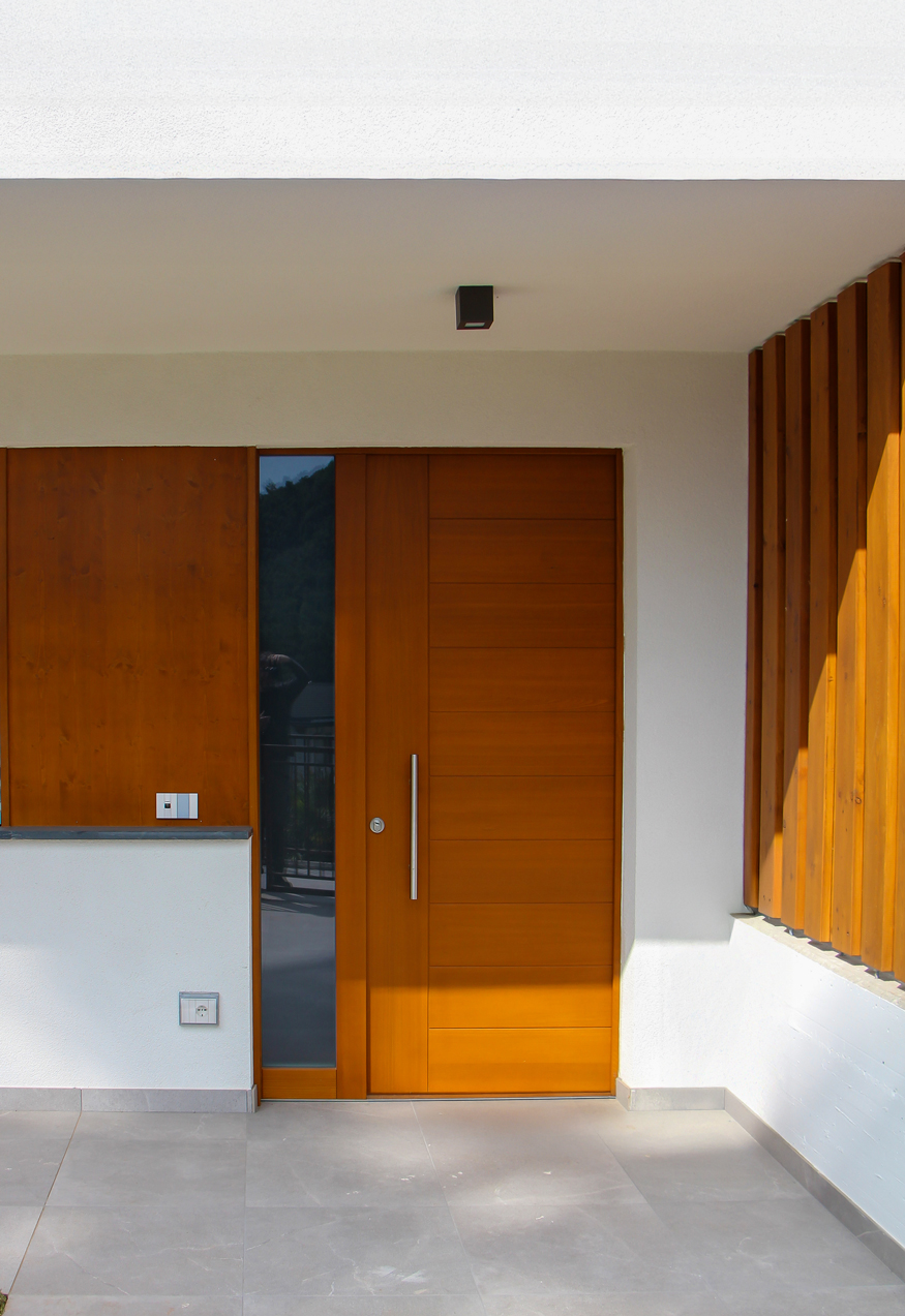In legno anche la porta d’ingresso e il relativo tamponamento laterale.