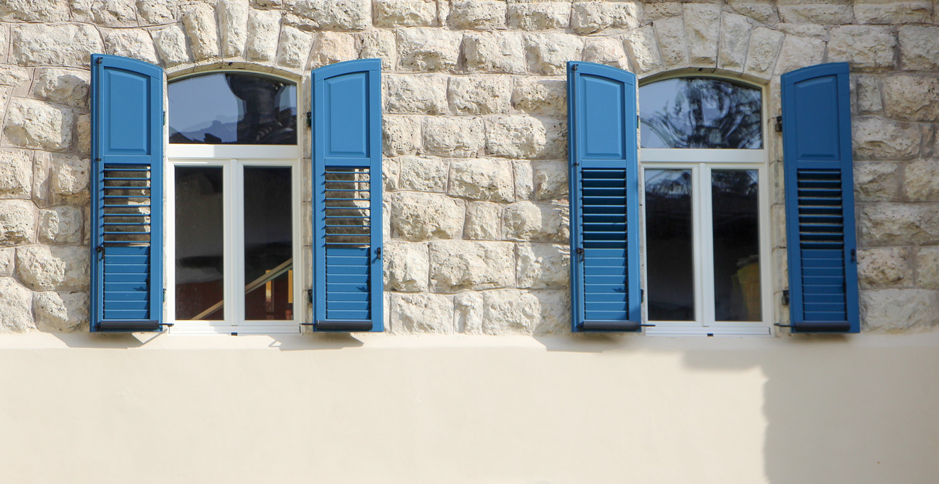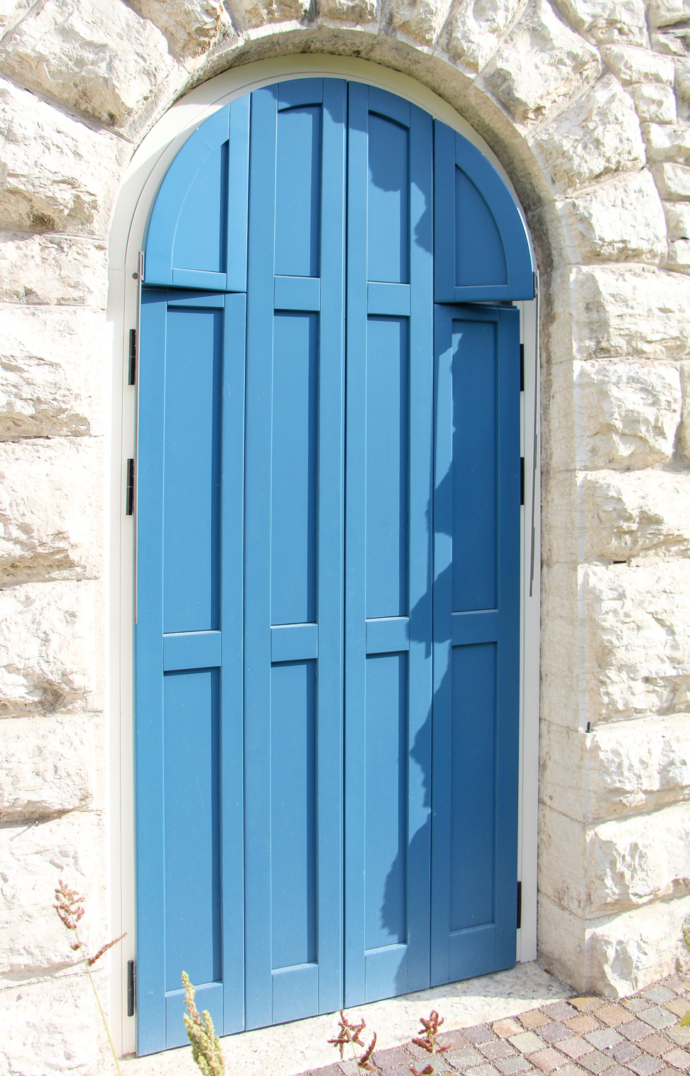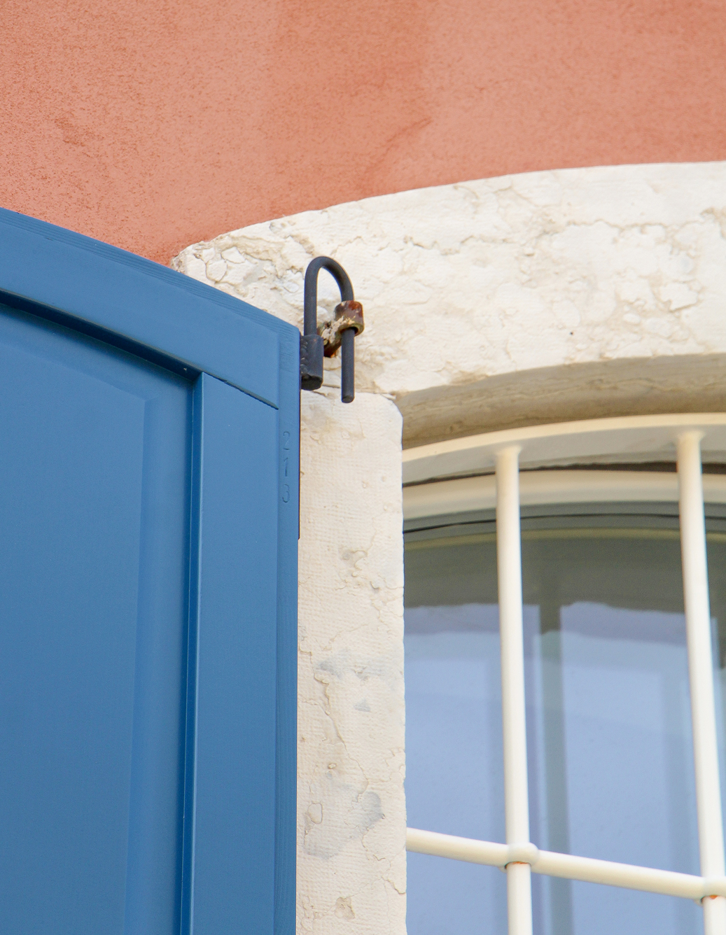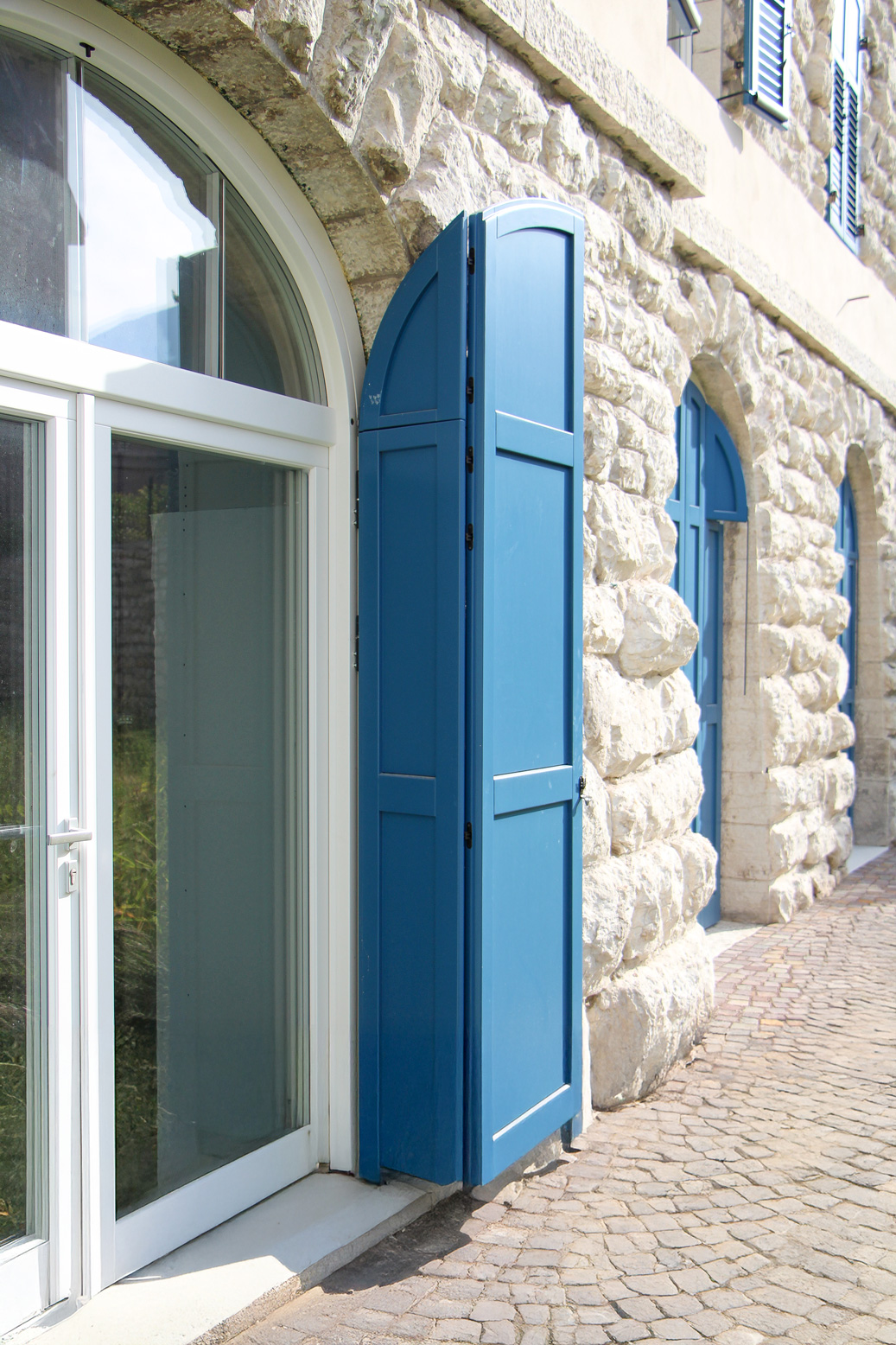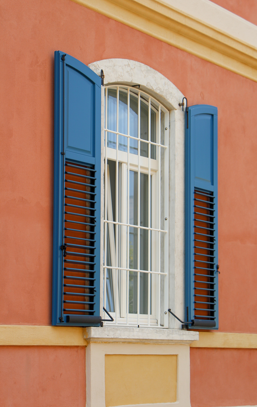 Gli scuri, con pannello bugnato e griglia mobile, sono realizzati sia rettangolari che ad arco, in un gioco visivo movimentato. Il colore è un particolare e vivace blu. Gli scuri delle portefinestre sono a libro.